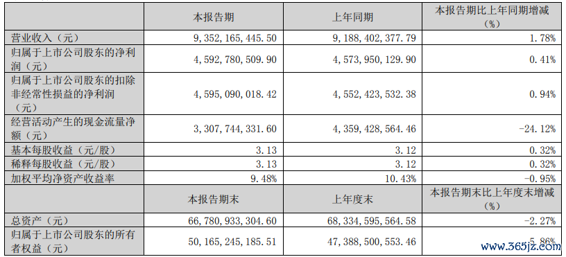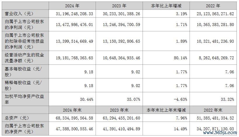 报告期内,泸州老窖实现营业收入311.96亿元,同比增长3.19%;实现归属于上市公司股东的净利润134.73亿元,同比增长1.71%。